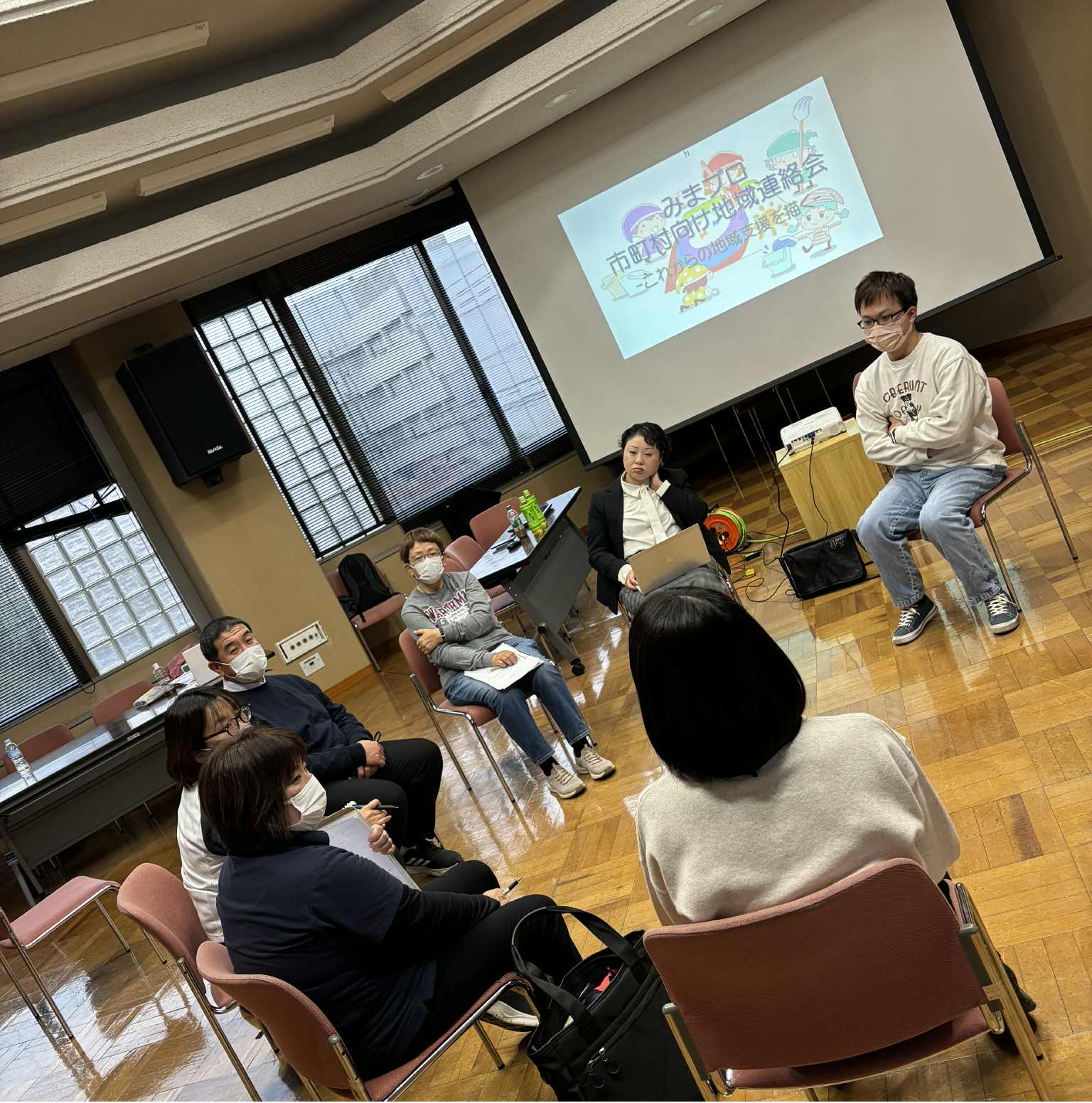 令和7年令和7年2月21日(金)に対面形式にて開催させて頂きました。参加者は全体で22名(市町職員13名リハ職9名)でした。今回は、男性の介護予防をテーマに浅口市で行っているサロン支援、リハ職から体操についての提案を行い実際に体験してもらいました。この会を通して、リハ職からの支援の重要性も感じてもらうことができたように思いました。また、その後の意見交換では、市町職員間やリハ職から市町への質問など活発に意見交換が行われました。オンライン形式では味わえない臨場感や、顔の見える会話を通して感じでつながりは対面形式の良さだと思いました。